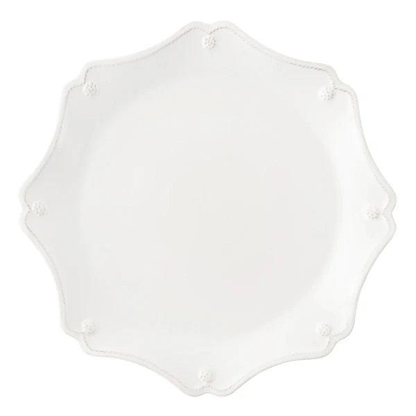 From Juliska's Berry & Thread Collection- Featuring an elegant scalloped edge trimmed with our thread and berry motif, this classic foundation piece elegantly frames your place setting and doubles as an abundant dinner plate or serving platter.