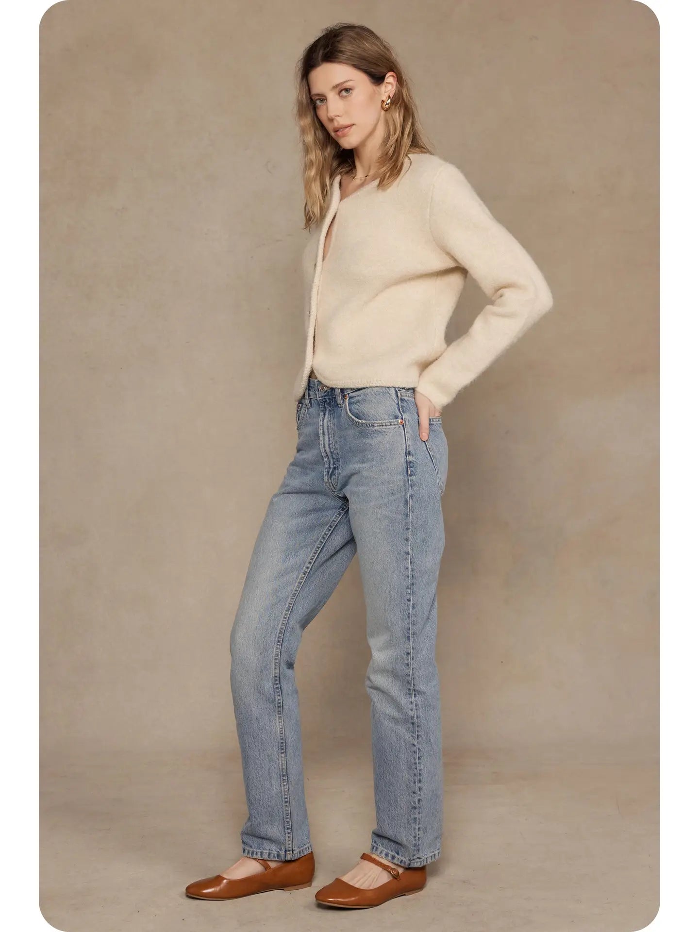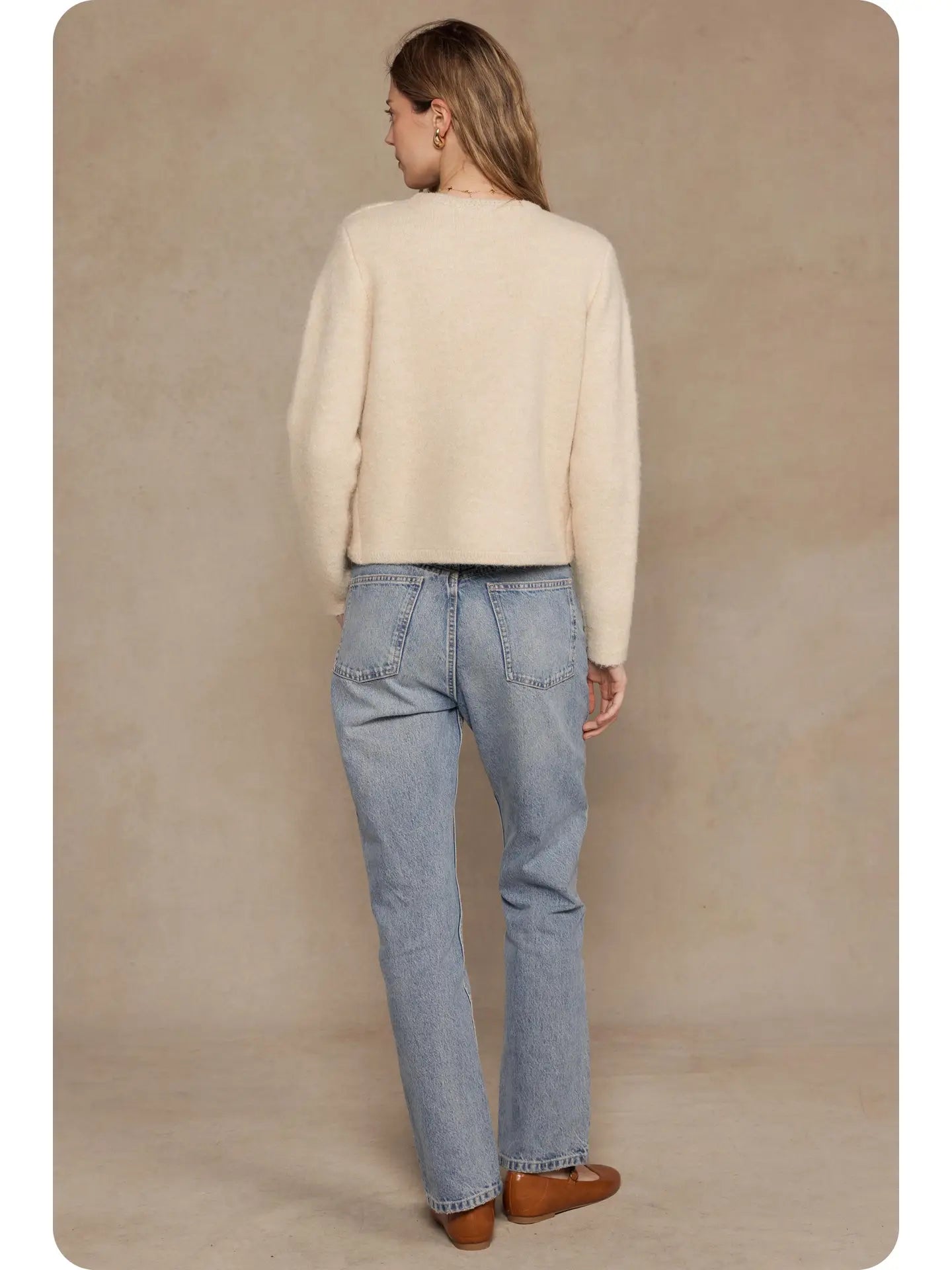 Studio Strut and Bolt Collection. Button down cardigan jacket sweater in knit fabric. This soft knitted style features gold button closure at front, braid trim throughout hem/neck, round neckline, and long sleeves.
