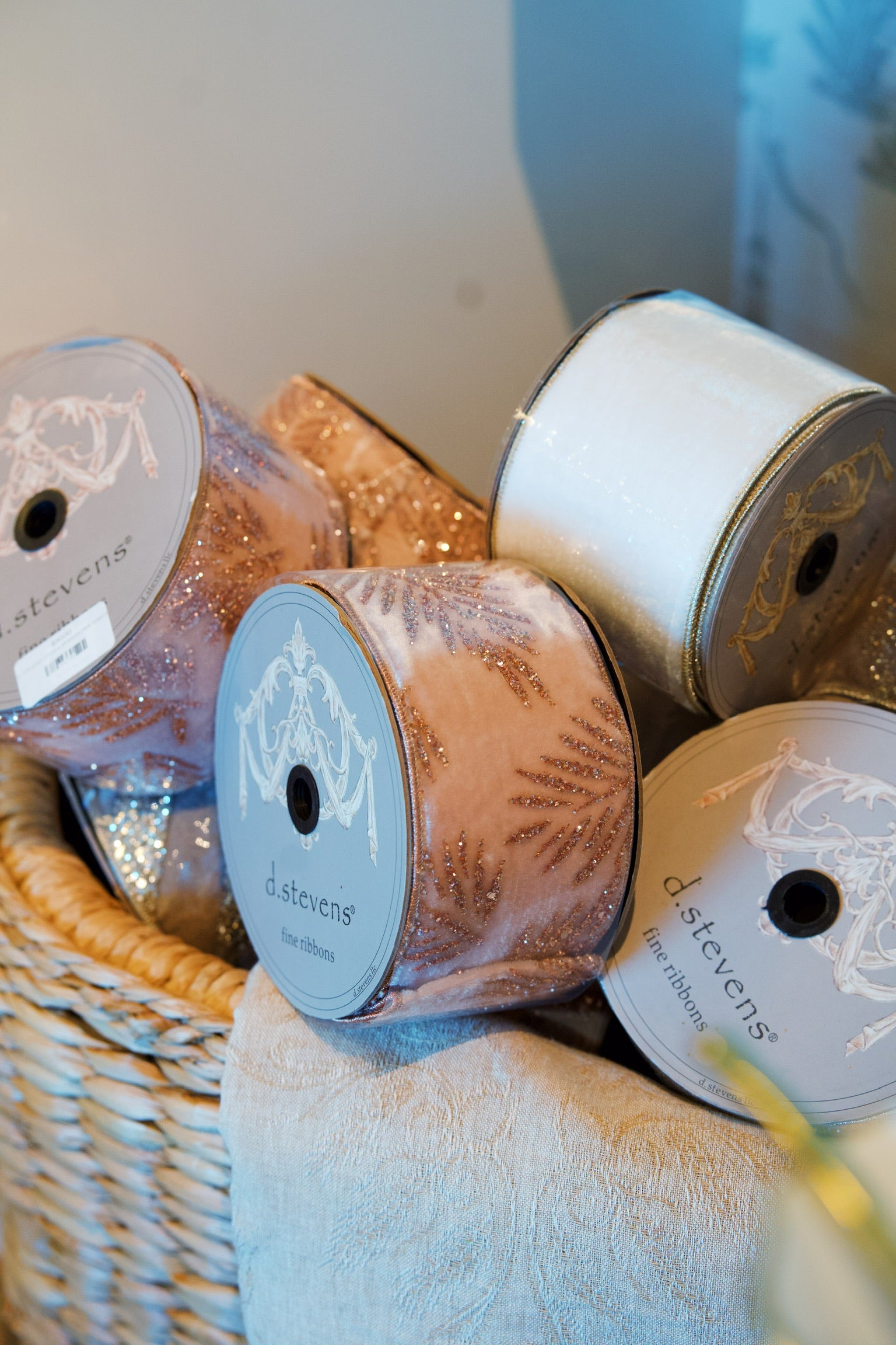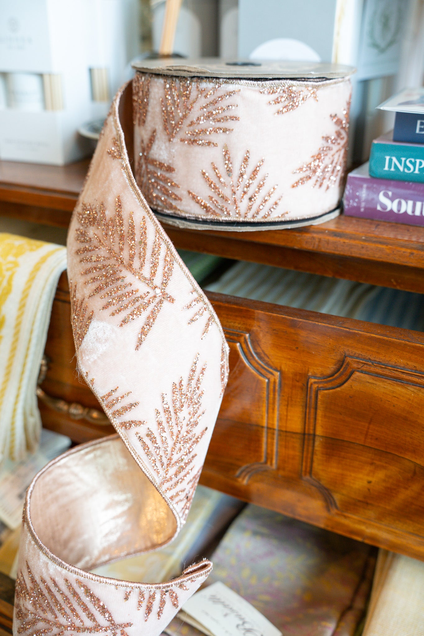 The blush pink base provides a soft, luxurious foundation, while the shimmering leaf detailing adds refined elegance to any package or craft project. Perfect for high-end wrapping, floral arrangements, or decorative accents, this ribbon combines tactile richness with contemporary design.