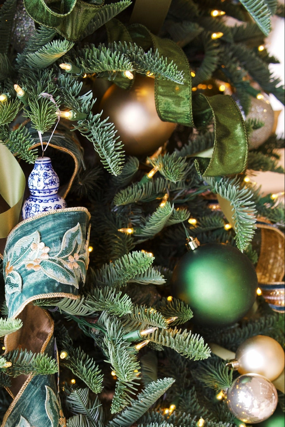 A refined velvet ribbon featuring embroidered bay leaf detailing in a subdued cottage green colorway with a metallic gold backing. 4" x 10 yds