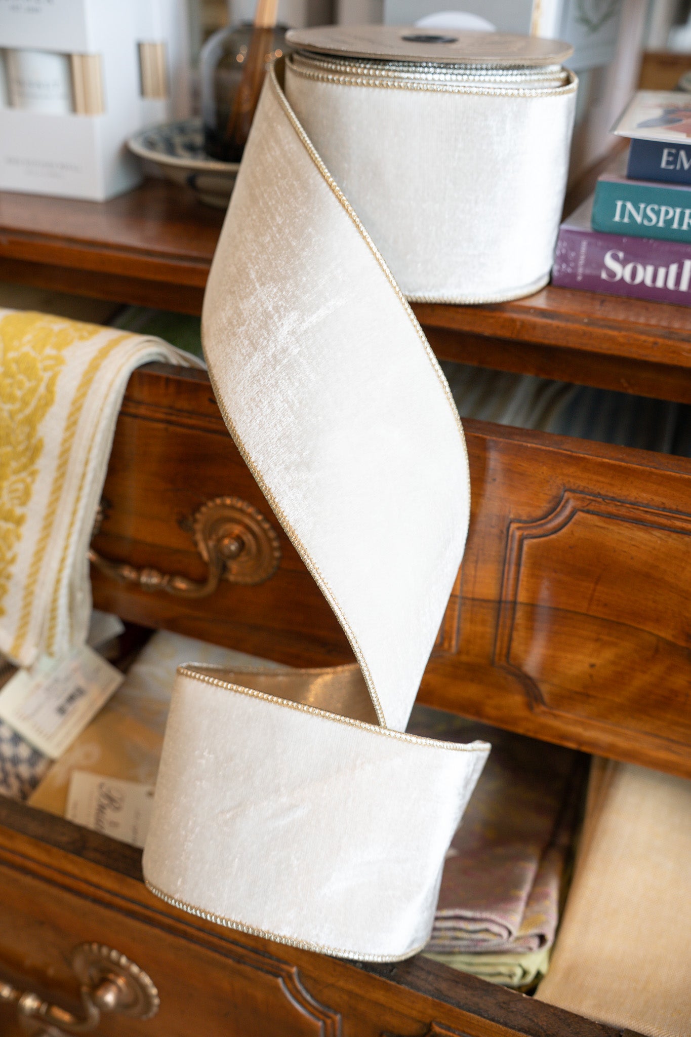 Elevate your seasonal displays with this premium 4" x 10-yard velvet ribbon in winter white with metallic backing and gold trim . The luxurious pile fabric drapes beautifully, making it ideal for wreaths, garlands, gift wrapping, and floral arrangements.