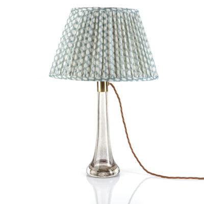 Round Bedwyn Empire Gathered Lampshade in Light Blue Wicker 100% linen sheer. Balloon lined in cream light cotton matching the frame colour. All our lampshades are designed and hand-made in our Studio and Factory in Wiltshire, England using light linen and light cotton fabrics printed in-house.