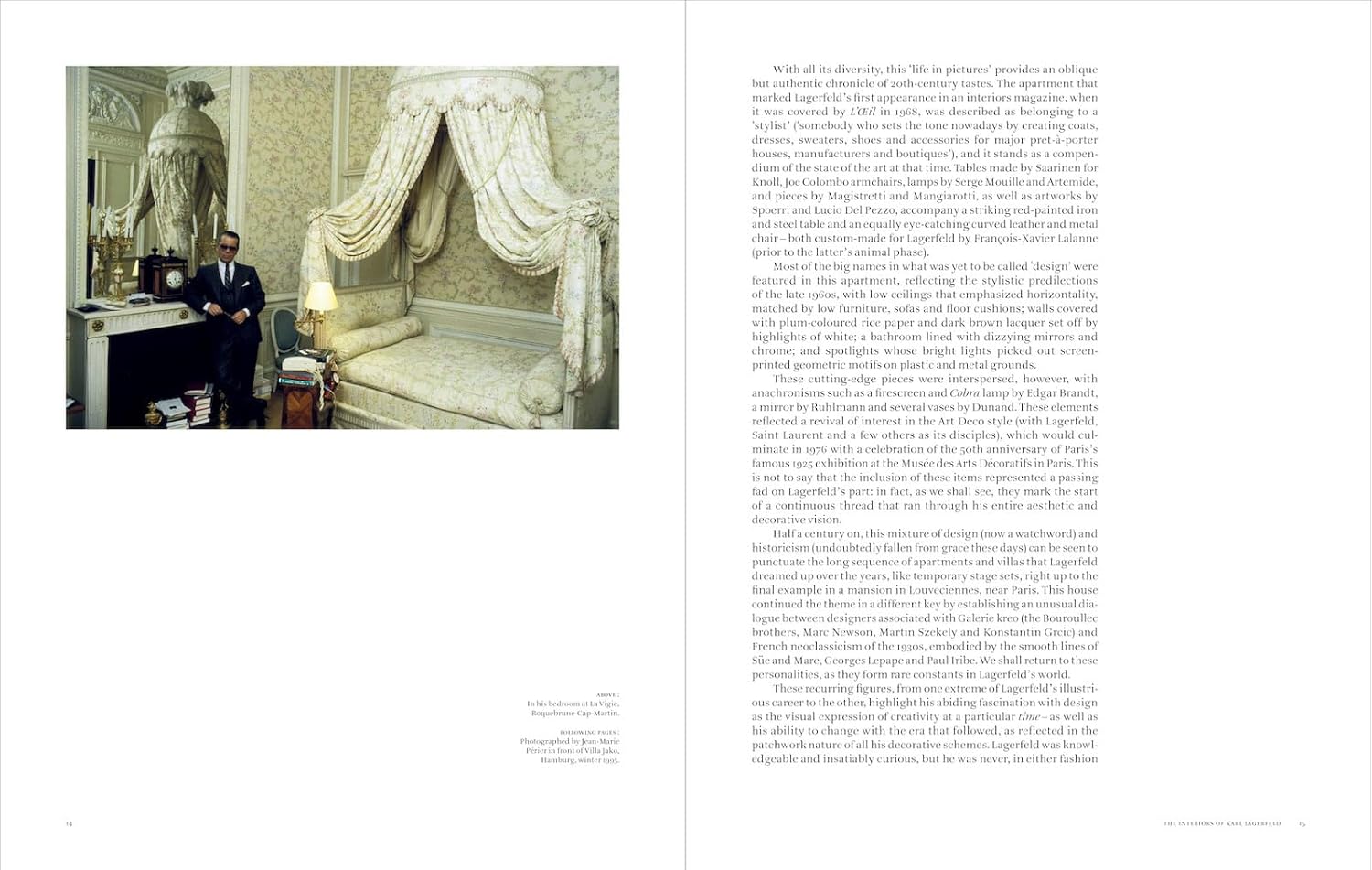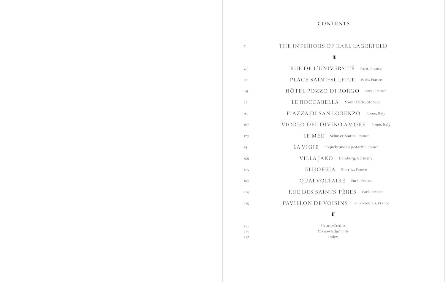 Following an introduction by Patrick Mauriès, each house is introduced by a short text by Marie Kalt unveiling the history of Lagerfeld’s homes while identifying key designers and pieces. From his elegant art deco–inspired apartment in Saint-Sulpice, Paris, to the incredibly ornate eighteenth-century mansion Hôtel Pozzo di Borgo, Lagerfeld’s houses reveal he was a collector on a Renaissance scale as they showcase his spectacular range. Lagerfeld balanced the old with the new and moved from one atmosphere to the next, leaving a Memphis-designed apartment in Monte Carlo for a grand tour–themed Roman pied-à-terre, followed by bucolic French country houses and even a majestic Nordic villa in his native Hamburg.