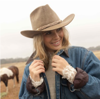 Our modern interpretation of the cowgirl shape in a flecked almond felt accented by braided recycled silk sari ribbon and metallic bead accents.